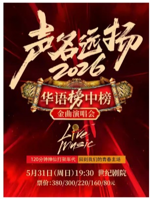 声名远扬 2026·华语榜中榜金曲演唱会时间:2026.05.31 周日 19:30场馆:北京市 | 世纪剧院票价:160/220/300/380微信订票:18515362586电话订票:010-66552100,010-66552258